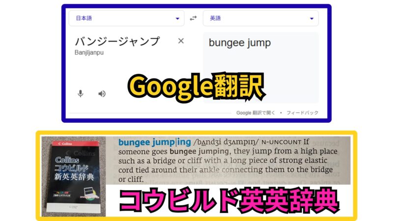 冒頭で述べた通り、Google翻訳に「バンジージャンプ」と入力すると「Bungee jump」と表示されます。さらに手元にあったコウビルド英英辞典で調べると「bungee jump│ing」との記載がありました。