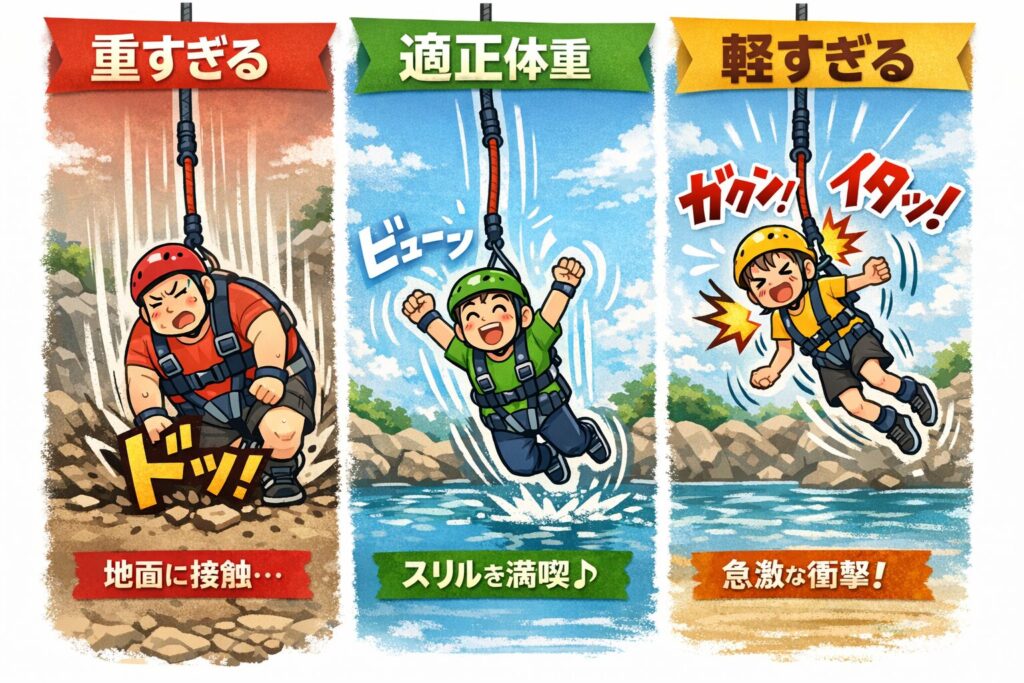 バンジージャンプのロープは飛ぶ人の体重の影響で伸び、そして上に引き戻されます。適正体重の場合はロープが一定の距離まで伸びるため体への負担は少ないです。しかし体重が軽すぎる場合はロープが伸びず、飛んだ人は一番下に来た瞬間に大きな衝撃を受けることになります。さらに体重が軽いと高く跳ね上がるため、ジャンプ台や橋などに衝突する可能性もあります。