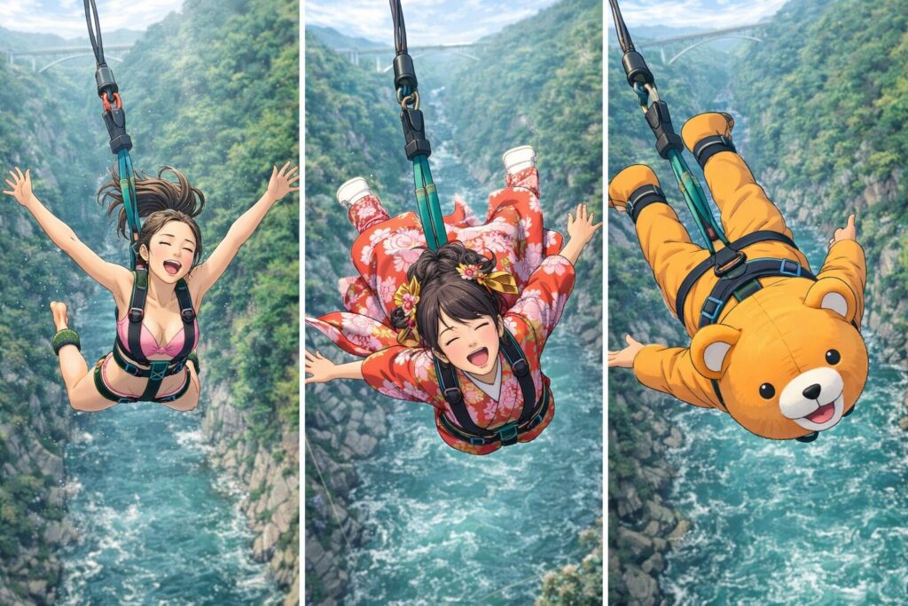 バンジージャンプの起源であるナゴールが成人の儀式というイメージがあることから、その年の成人を対象に無料開放されることの多いバンジージャンプ。成人の日の前後には晴れ着姿でジャンプする姿を各ニュースで目にすることがあります。しかし最近の案内を見ると、着物でのジャンプがNGとなっている施設もあるため、徐々に着物で飛ぶことのできる施設は減っているのかもしれません。過去にはバンジージャンプ専用着物を貸し出している施設もあったようなので、どうしても成人記念に晴れ着姿で飛びたい方は運営会社へ確認してください。